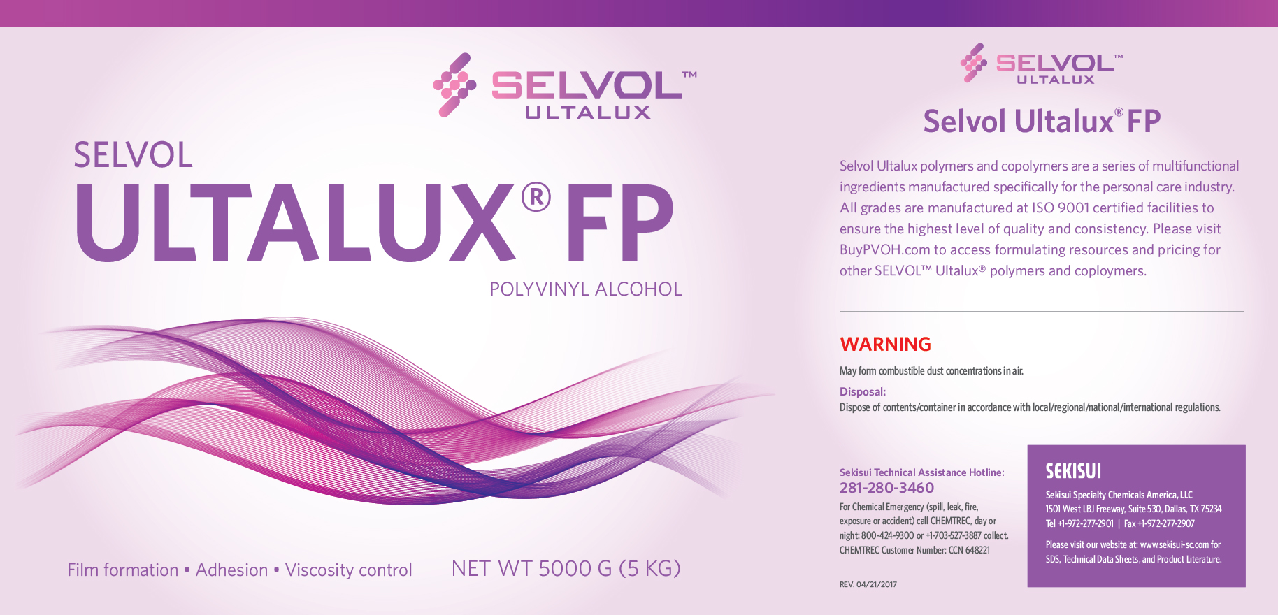Selvol™ Ultalux FP polyvinyl alcohol (PVOH) finds application in skin care masks and eye shadow, eye liners, mascara, and other color cosmetics applications. It is also ideal for instant lifts and other anti-aging formulations. The low solution viscosity of Selvol™ Ultalux FP makes it ideal for use in BB creams and other applications where multiple functions are required. Used in personal care formulations for decades, Selvol™ Ultalux FP is a cosmetic grade tested for high quality and purity and is non-irritating on skin in skin care formulations as verified by third party testing.